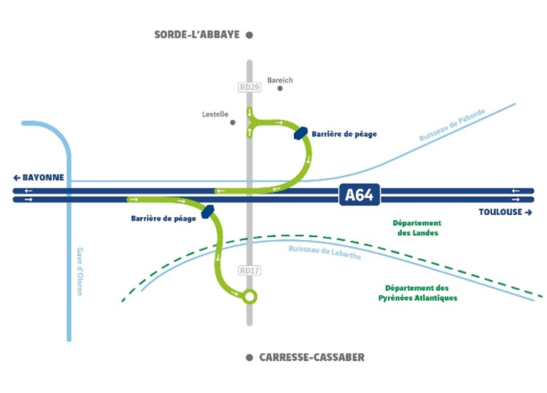 Situé au carrefour des départements des Landes et des Pyrénées-Atlantiques, entre l’échangeur de Peyrehorade (n°6) et celui de Salies-de-Béarn (n°7), le futur demi-échangeur de Carresse-Cassaber / Sorde-l’Abbaye se déploie sur le territoire des communes de Sorde-l’Abbaye (40) et de Carresse-Cassaber (64).