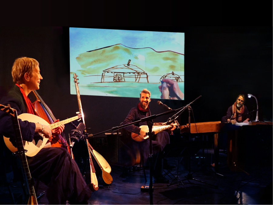 Des Balkans à l’Afghanistan en passant par l’Asie centrale, les chanteurs multi-instrumentistes Emmanuelle Troy, Michaël Amouroux et le dessinateur Philippe Bichon nous offrent un grand voyage, un dialogue inédit entre musiques traditionnelles réinventées, dessins et bande-son (paysages sonores, lectures & témoignages). Il y est question d’itinéraires, d’hospitalité, de rencontres ou de confrontations entre ceux qui posent le pied en terre étrangère, de leur plein gré ou par obligation, et ceux qui vivent là. Plus de 15 instruments rares, d’univers vocaux et de langues (ouïghour, albanais, kurde, ukrainien, rromani, kirghiz , persan…), pour une exploration sensible, musicale et visuelle, à hauteur d'humanité.
